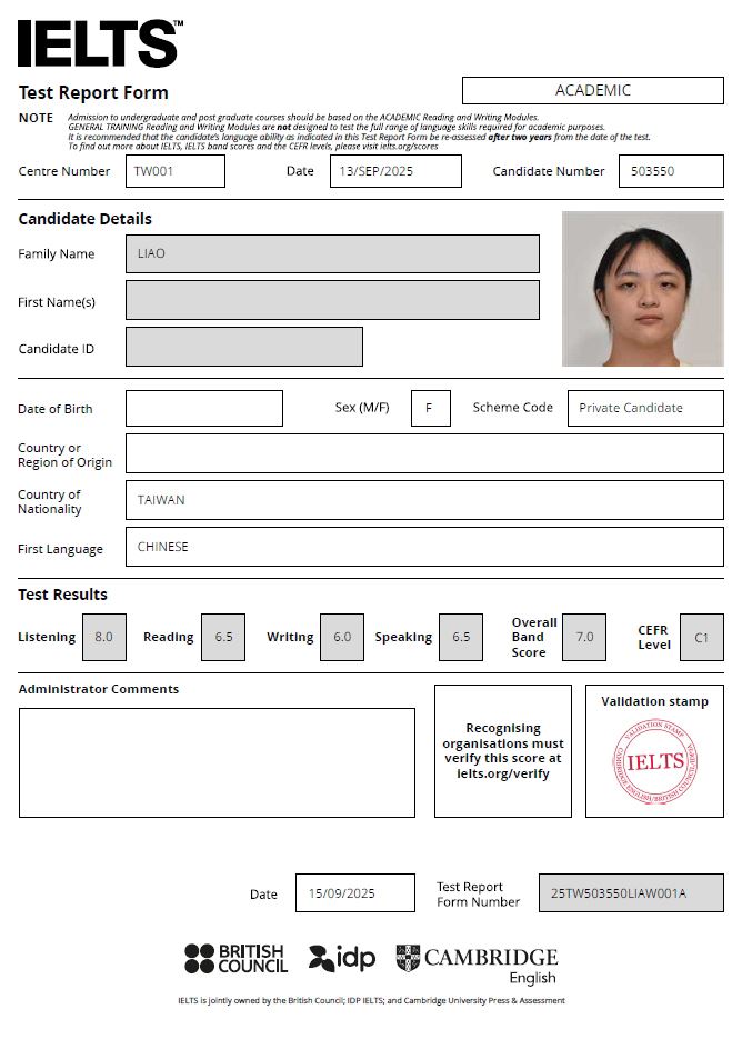 恭賀 廖同學 取得 雅思測驗7.0級分