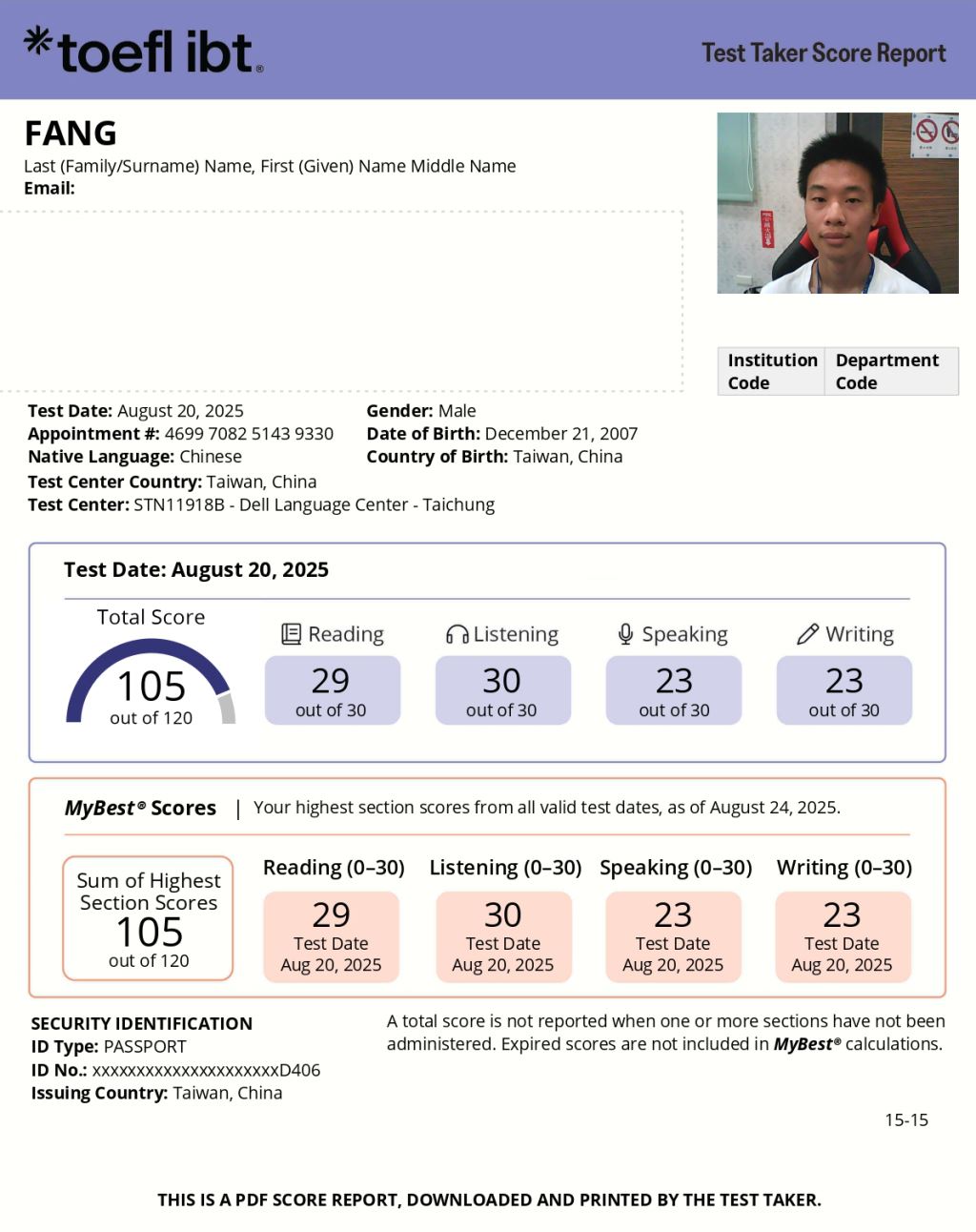 托福iBT測驗高分榜單!恭賀房同學取得托福測驗105分好成績,高分心得分享如下: